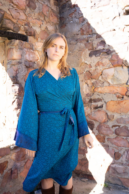 The Sari Wrap Dress is where timeless femininity meets sustainable style—crafted for the free spirit who moves through life with purpose and ease. Handmade from up-cycled silk blend saris and brought to life by skilled artisans in South Africa, each dress is a one-of-a-kind piece.